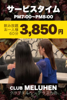 サービスタイム実施中! 熱海キャバクラ クラブメルヘンアラスカ店では19:00から20:00のあいだ、お一人様60分飲み放題のサービスタイムを実施中です。比較的早い時間で、カップルでも楽しめる人気のサービスとなっていますので、熱海の夜の始まりに是非ご利用ください。
